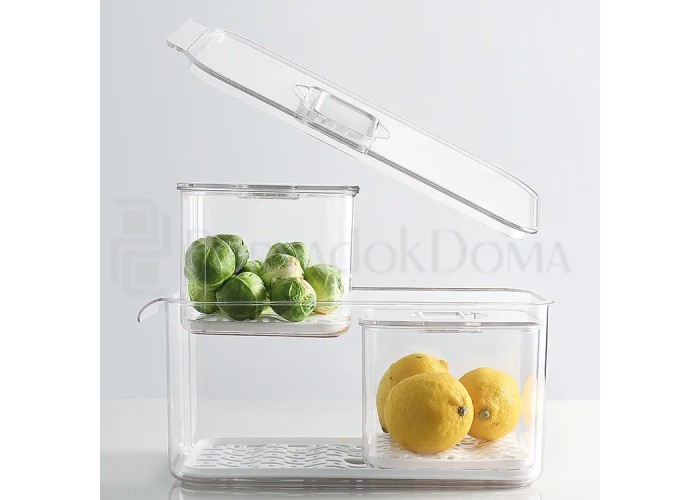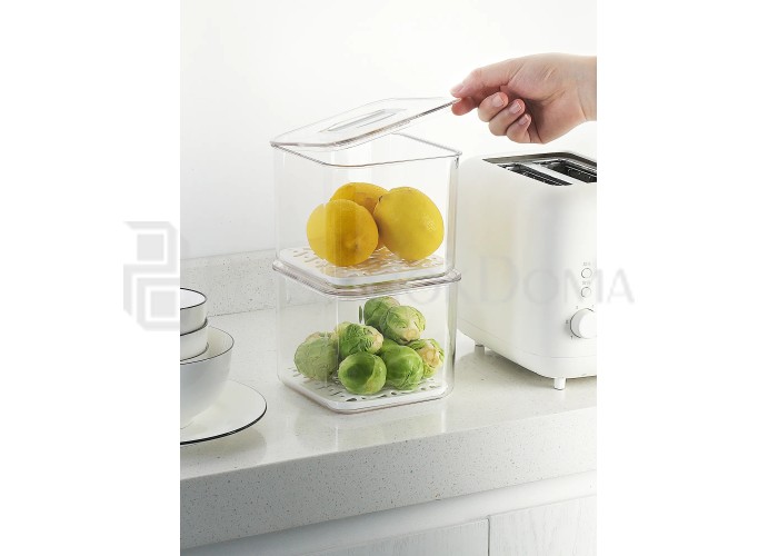 Этот контейнер оптимизирует пространство и обеспечивает удобство за счет правильной формы, занимающей минимальную площадь на полке холодильника и использующей полезную высоту полки.
